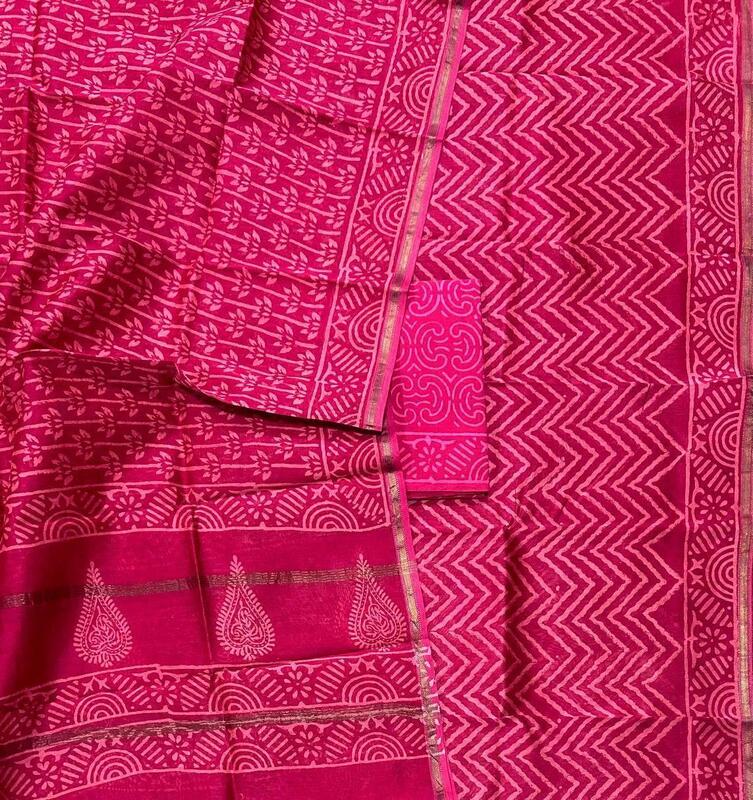 Fine quality Maheshwari Silk Cotton fabric 3 piece (Top+Bottom+Dupatta) unstitched suit set fabric , with Bagru Print in vibrant colours. The product from Bagru town from State of Rajasthan India.