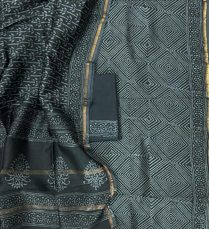 Fine quality Chanderi Silk Cotton fabric 3 piece (Top+Bottom+Dupatta) unstitched suit set fabric , with Bagru Print in vibrant colours. The product from Bagru town from State of Rajasthan India.