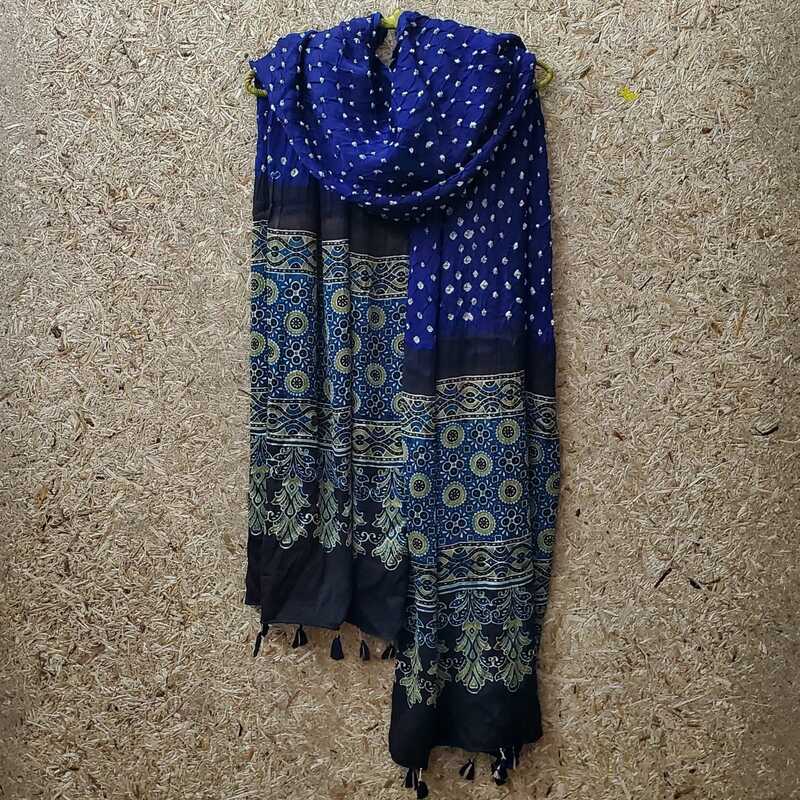 Bandhej tie & dye vibrant colours Print Modal Silk Dupatta enhanced with Ajrakh print panels and embellished with hand made tassels. A product of Kutch region from State of Gujarat Indian.