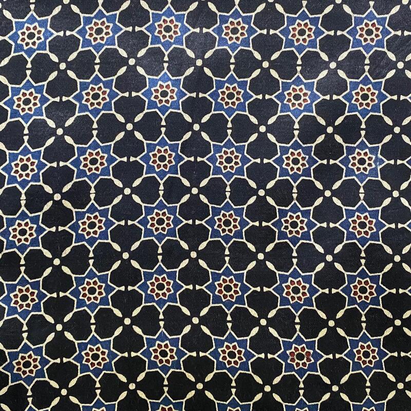 Mashru Silk Fabric, woven with perfect blend of silk and cotton. The outer fabric is of silk and inner is cotton, so you get luxury of silk and comfort of cotton. Printed with Ancient AJRAKH printing technique from the region of Kutch in State of Gujarat India. Using natural dyes and colours. Suitable for all clothing purposes.