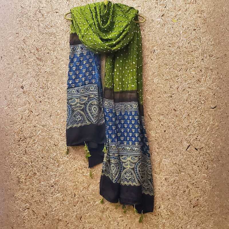 Bandhej tie & dye vibrant colours Print Modal Silk Dupatta enhanced with Ajrakh print panels and embellished with hand made tassels. A product of Kutch region from State of Gujarat Indian.